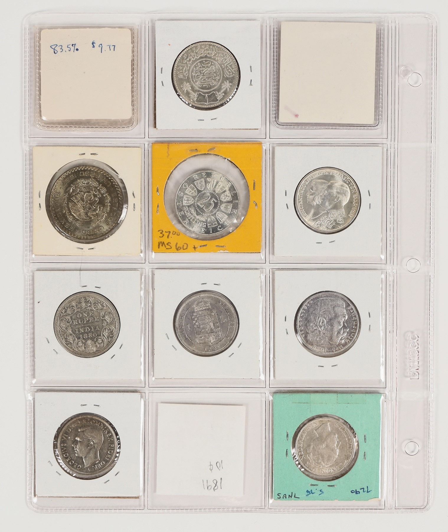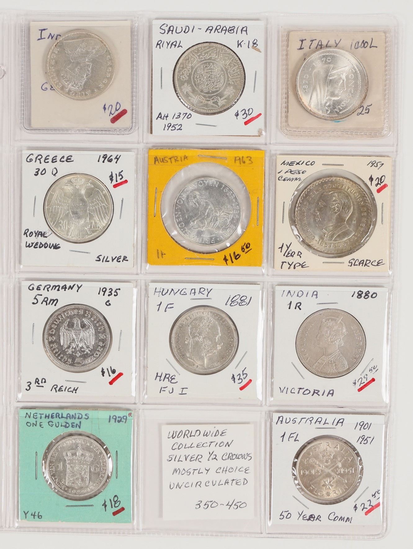 Group of eleven coins from India (2), Saudi Arabia, Italy, Greece, Austria, Mexico, Germany, Hungary, The Netherlands, and Australia. Various denominations and mint dates, See photos for design details.