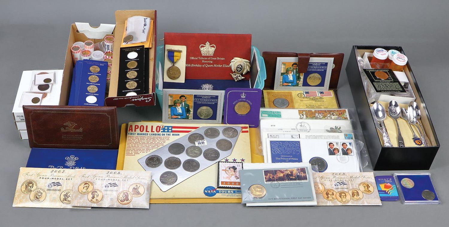 hundreds of coins, unsearched other than for this very brief description; highlights include 2 different 1909 Hudson-Fulton Expo coins; an 1847 U.S. Large Cent in Choice Fine to VF condition; 3 different First Spouse Bronze Medal Sets of 4; 8 different ornate silver spoons, possibly sterling, with a weight of close to 3 ounces; Coin and currency covers for different world events; 12 uncirculated rolls of 25 coins of presidential, Statue of Liberty, and SBA $1 dollar coins; 3 uncirculated rolls of state quarters and hundreds of other coins, unsearched, please inspect, surprises await the diligent viewer (hundreds of coins with a face value of over $400). Shipping charges apply - weight 24 lbs.
