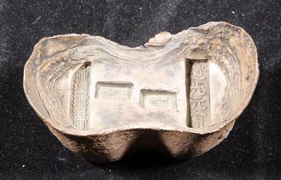 Worldwide. Odd and Curious. China. 50 Tael Sycee. Silver. 4.6 pounds. Length 4 3/4 inches and height 2 3/4 inches. Also called "shoe" money and "boat" money. Tao-kuang, 1821-1851. Very Fine.