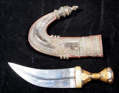 Worldwide. Odd and Curious. Dragger and sheaf. Probably from the Far East Region. Blade 8 inches long. Gilt and leather handle with copies of coins from Venice. The sheaf is silver and leather. Probably 19th century.