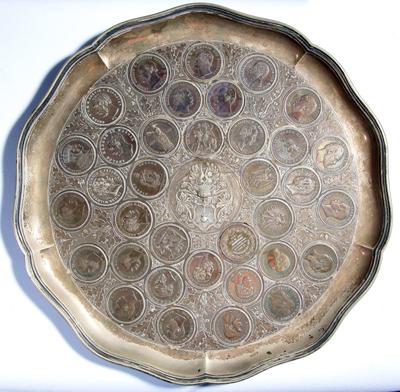 Worldwide. Odd and Curious. Silver Serving Tray. Total weight 3.08 pounds. Stamped .800 Dresden. 35 German 19th century talers plus one Austrian taler embedded with a crest in the center. Engraved on the back 24 September 1892 and family names. Wired on the back for hanging.