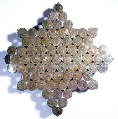 Worldwide. Odd and Curious. Silver Trivet. Total weight 2.6 pounds. Eight female winged silver legs (one broken). The tray potion is made by soldering 73 Silver French Louis XVI Jetons together across a wire frame.