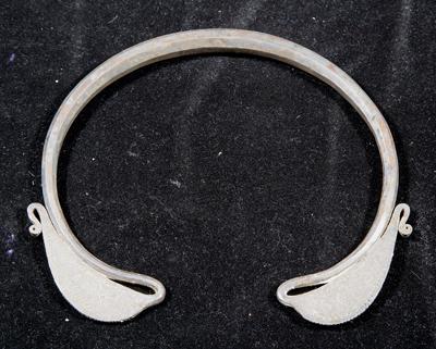 Worldwide. Odd and Curious. Solid Neck Ring. From the Far East region. Silver. 448. grams. 7½ inches across. Plain solid silver torque with flattened back-turned ends. The two ends have a chased design.