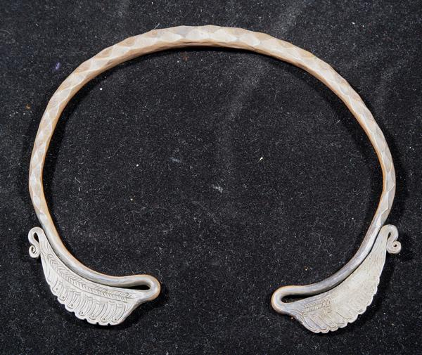 Worldwide. Odd and Curious. Solid Neck Ring. From the Far East region. Brass. 379 grams. 7½ inches across.Hammered torque with flattened back-turned ends. The two ends have a chased design.
