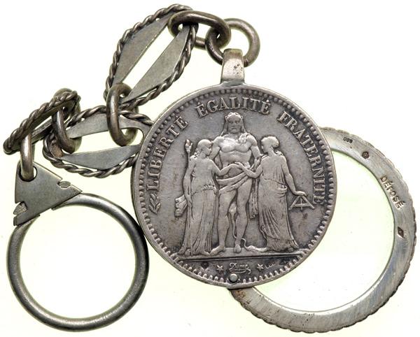 Worldwide. Odd and Curious: An interesting magnifying glass made from a French 1873 Silver 5 Francs. Stamped 'Depose' .800. With a chain fob. Probably made in the late 1800.'s. Very Fine.