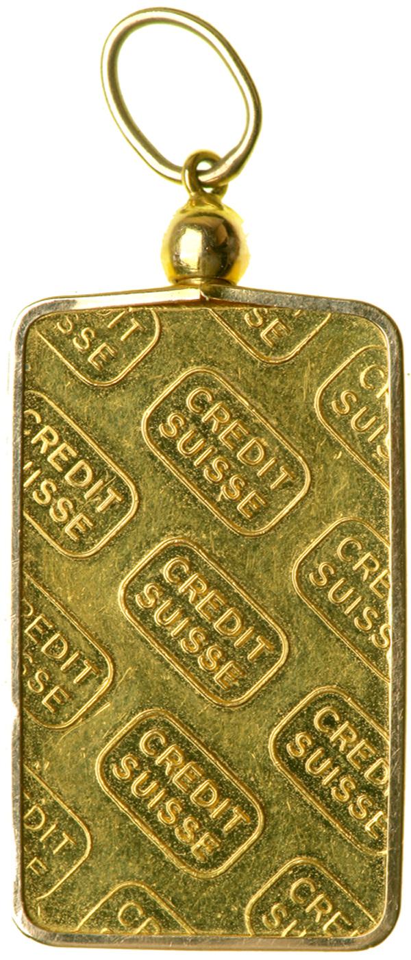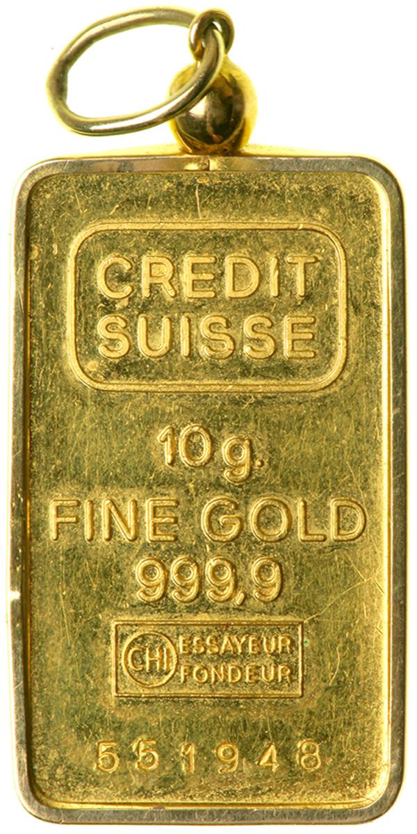 Worldwide. Small Gold Bar, 10 Grams. Credit Suisse. 999.9 Fine. In 14K Bezel. Total weight 10.66 grams. About Uncirculated.