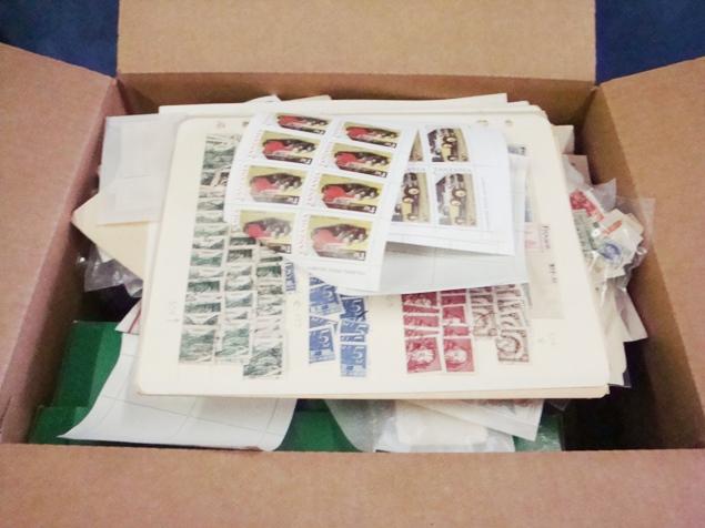 (1000)'s of stamps, mostly loose in small boxes, bags and glassines. Most appear to be off paper. Much to sort through. Could be some better material here but it would require patience to go through all this. Est.$150-200