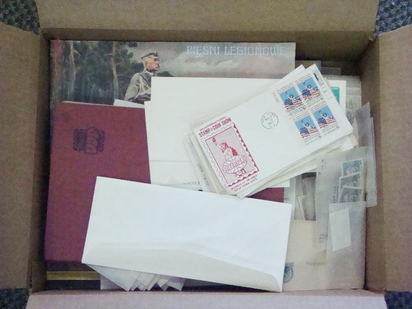 Many (100) stamps and covers from all over the world, in glassines, on pages, in envelopes, etc. Noticed better souvenir sheets with good Germany and Qatar. Good topicals with much Roosevelt. A binder full of post cards, even a Polish Legion recording. We