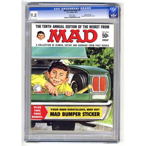 <B>Worst From Mad #10 Gaines File pedigree (EC, 1967) CGC NM/MT 9.8 White pages.</B></I> This sharp square bound issue includes the bonus Mad Bumper Sticker. This is one of three copies of this issue found in publisher Bill Gaines' files after his death. Overstreet 2005 NM- 9.2 value = $160. CGC census 11/05: 3 in 9.8, none higher.