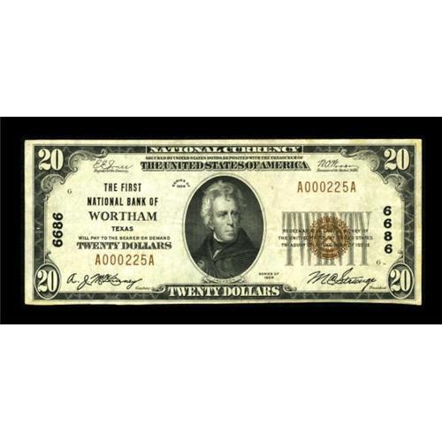 <B>Wortham, TX</B></I> - $20 1929 Ty. 1 <B>The First NB</B></I> Ch. # 6686<BR> This is a lightly handled <B>Extremely Fine </B></I>note which displays paper ripples. In the census for this Freestone County bank, not a single graded note surpasses the current offering, while only one note pulls even. <BR><BR><b>Shipping:</b> Coins & Currency (<a target="_blank" href="http://www.heritageauctions.com/common/shipping.php">view shipping information</a>)