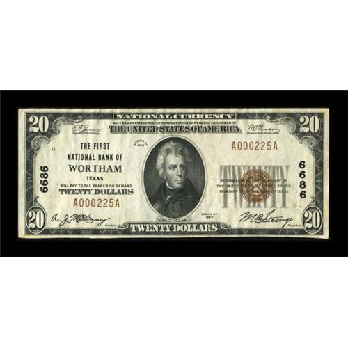 <B>Wortham, TX</B></I> - $20 1929 Ty. 1 <B>The First NB</B></I> Ch. # 6686<BR> This lightly handled <B>Very Fine </B></I>example has the appearance of a higher grade. <BR><BR><b>Shipping:</b> Coins & Currency (<a target="_blank" href="http://www.heritageauctions.com/common/shipping.php">view shipping information</a>)