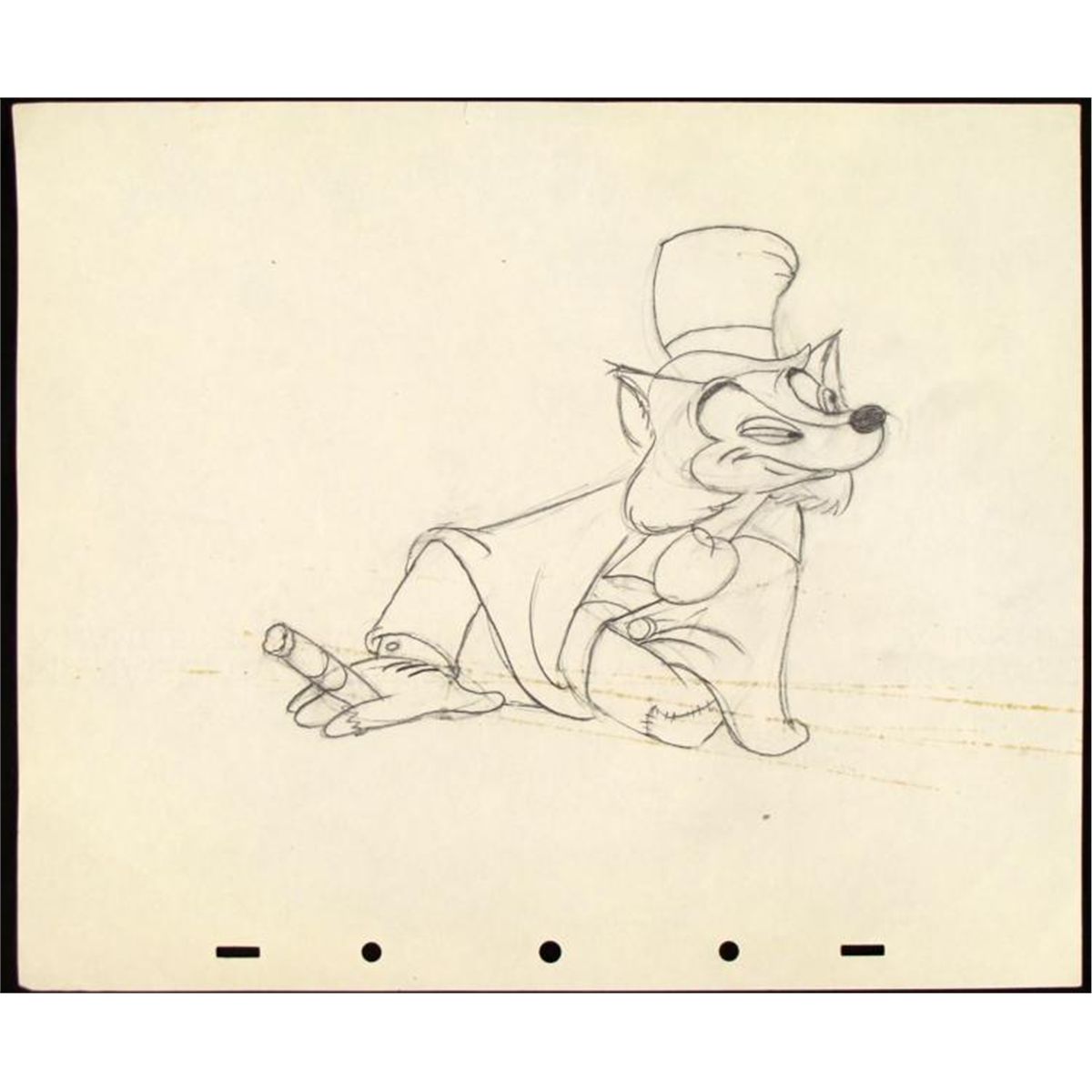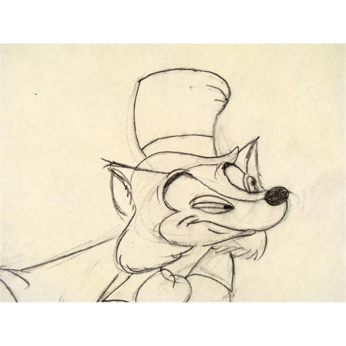 Offered here is an original production drawing of Worthington Foulfellow from Pinocchio. * Honest John is how many animated foxes are portrayed; sly and sneaky. He is also very smart and convincing. He has taken the "easy road" to success, and has never attended school. As a result, despite his cunning and persuasiveness, he can barely read or write. He is also not immune to being swindled himself, as Stromboli bought Pinocchio from him for far less than a living puppet would be worth. Honest John is remarkably persuasive, and can convince almost anybody to do what he wants. His plans are reliable and clever, but are often spoiled by his sidekick, Gideon. He is also not unwilling to kill in order to make money, and is entirely without conscience, fearing only the law and the Coachman. * I have an offer for you that you can not refuse... * Original "rough" animation drawing, in black and red with the notations in black. * Overall size is a 12-field drawing that is 10 1/2" × 12 1/2" Very Good condition Traditional animation is a multi-step process which includes various types of art techniques. Drawings are a key part of the process, in which the animator creates the design and movement of the characters. Drawings are then transferred onto acetate cels (by hand-inking and/or photo copying) to create a production cel, which is then hand painted on the back side, using paint colors chosen and approved by the creator of the series. * * The drawing is ready to be matted and framed. The animators notations are located at the top and bottom of the drawing. There is some storage stains at the bottom of the drawing. *