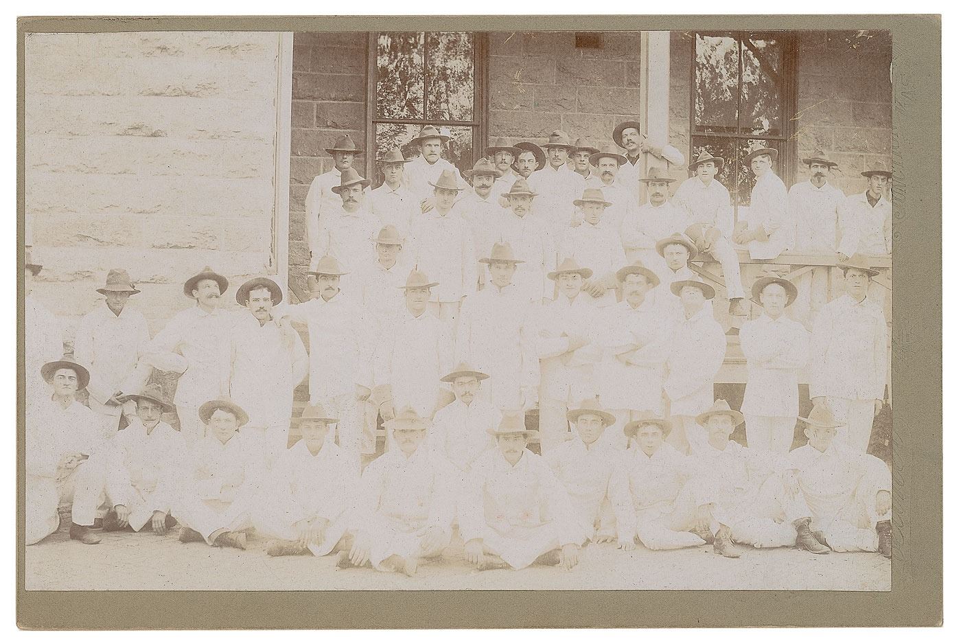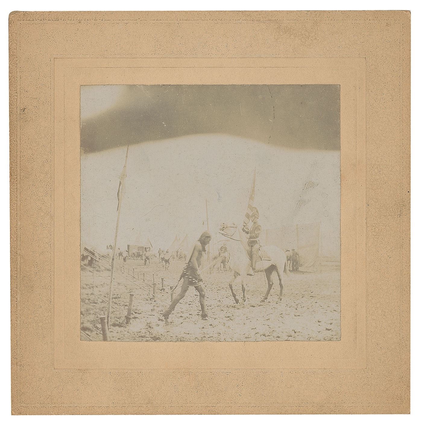 An albumen photograph of the men in Buffalo Bill's Wild West show, captioned within the image, "Dressing Room at Buffalo Bill's Wild West 1897," affixed to a 12 x 10 mount.