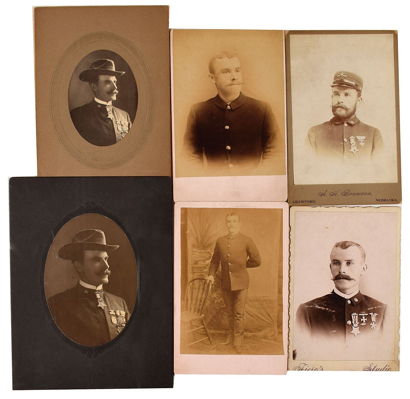 Ten mounted albumen portraits of Paul H. Weinert throughout his military career, highlighted by a rare early oversized portrait of him wearing his newly earned Medal of Honor, affixed to a 7.75 x 10 mount. Others include two different earlier cabinet portraits of Weinert in a military coat; an early cabinet portrait of Weinert by M. Hofsteater of the Wisconsin Territory, showing him in formal attire and holding his cap with the insignia of Battery 'E,' 1st US Artillery; another cabinet photo by Hofsteater, showing Weinert in uniform beside his horse; two identical cabinet photos by A. H. Baumann of Crawford, Nebraska, showing him in uniform with the insignia of Troop 'L,' 1st US Cavalry, with his Medal of Honor on his chest; a cabinet photo by Fiero's Studio, showing Weinert with three medals on his chest (including the Medal of Honor); and two identical oval portraits of Weinert wearing his medals by Barrows of Boston.