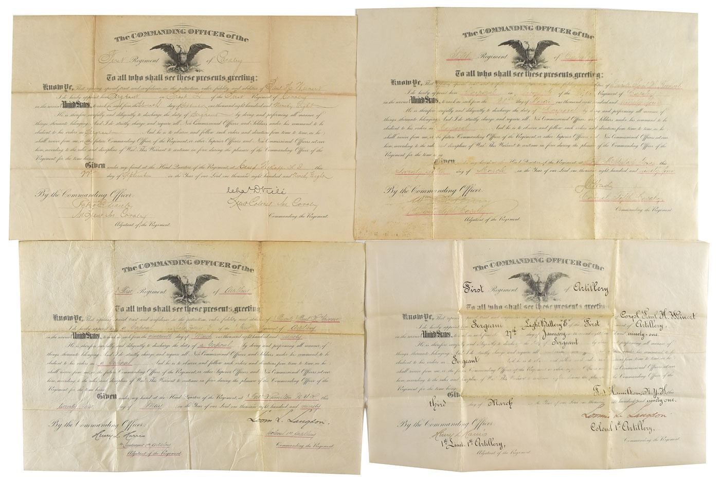 Four of Paul H. Weinert's military commissions, dated from 1890 to 1898, with appointments including: "Corporal in Light Battery 'E' of the 1st Regiment of Artillery" (1890); "Sergeant in Light Battery 'E' of the First Regiment of Artillery" (1891); "Corporal in Troop 'C' of the Fifth Regiment of Cavalry" (1894); and "Sergeant in Troop L of the First Regiment of Cavalry" (1898).