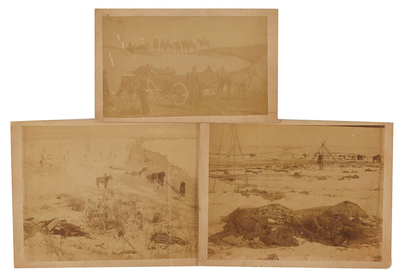 Three original mounted albumen photographs of the aftermath of the Battle of Wounded Knee published by the Northwestern Photographic Co. of Chadron, Nebraska, all with titles inherent to the image. Includes: an 8 x 5 photograph entitled "Gathering up the Dead at the Battle of Wounded Knee S.D.," showing a horse-drawn cart filled with bodies in the foreground, with cavalry officers on horseback silhouetted in the background; an 8.5 x 6.5 photograph entitled "Birds Eye View of Battlefield at Wounded Knee, S.D. looking North," showing Big Foot's camp three weeks after the massacre, with bodies of four Lakota Sioux wrapped in blankets in the foreground and American soldiers amid scattered debris of the camp in the stark distance; and an 8.5 x 6.5 photograph entitled "Birds Eye View of Can[y]on at Wounded Knee, S.D.," showing a wagon chassis with two dead horses in the foreground, and soldiers standing amidst the corpses of Native Americans scattered about the base of the canyon in the background.