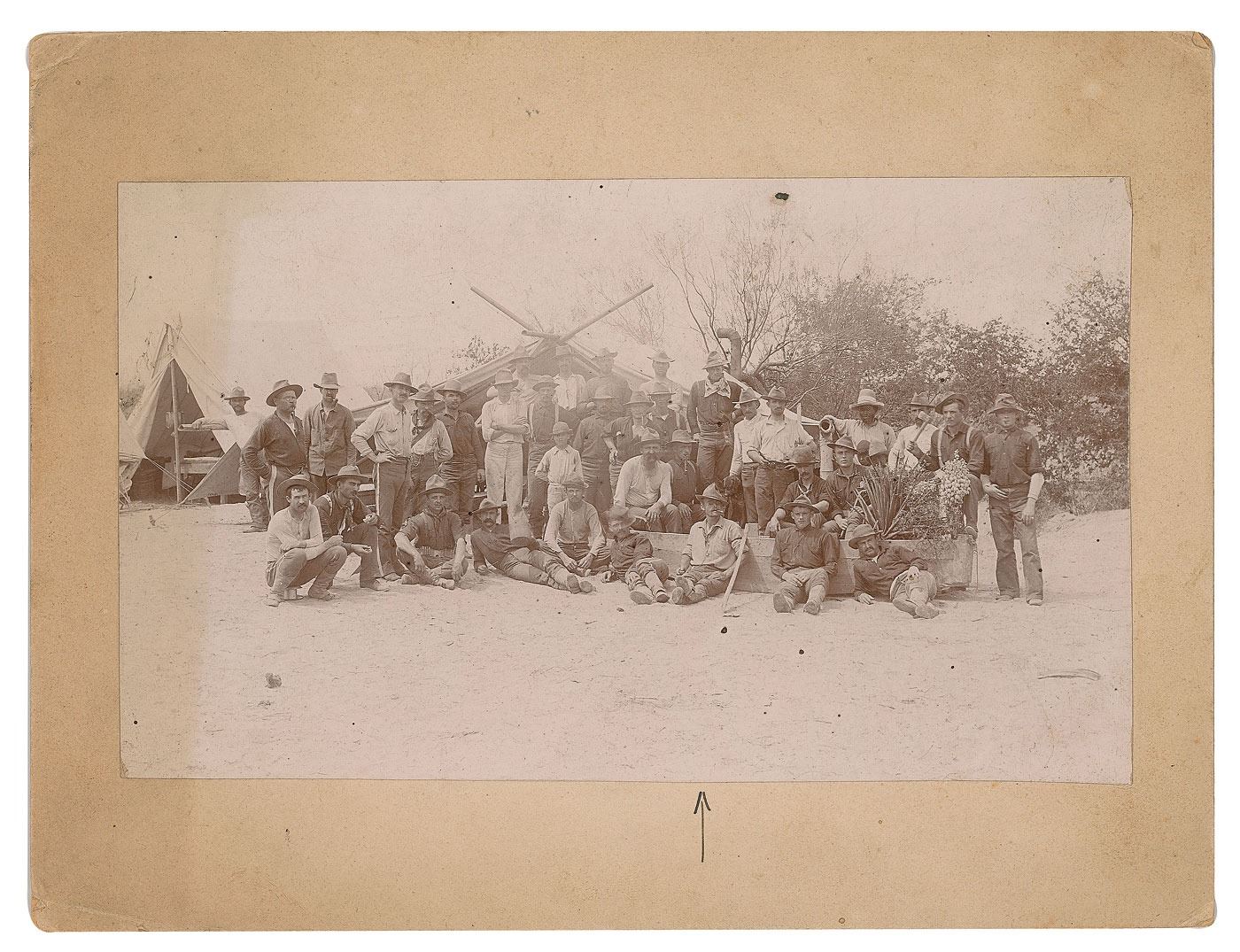 Four 8.5 x 6 albumen portraits showing artillery batteries from afar, with ink notations to several of the images (presumably identifying Weinert), affixed to larger mounts. One is annotated on the reverse of the mount, Light Batteries E & K - 1st N. Y. Artillery, Captains Allyn Capron & J. W. Dillenback, Presidio, San Francisco, California, 1889, Presented to M. P. H. Weinert, St. George Hotel, Brooklyn, N.Y., Sept. 13th 1900."