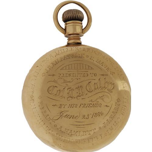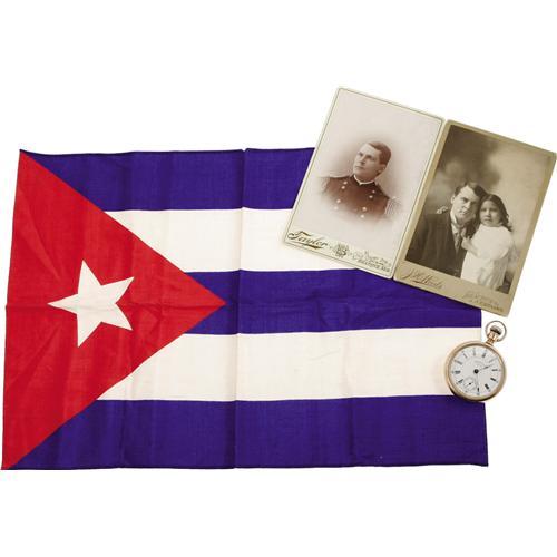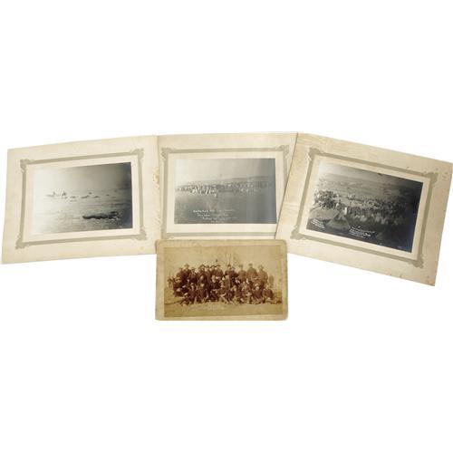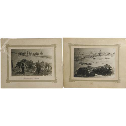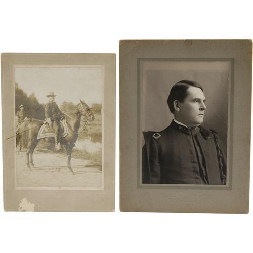 <B>Wounded Knee Massacre Archive Including Effects From the Estate of General Leonard W. Colby and Telling the Story of Lost Bird.</B></I> On December 29, 1890, troops of the U.S. 7th Cavalry were sent to round up and disarm members of the Lakota Sioux tribe for transport via rail to Omaha, Nebraska. Near the end of the disarmament process shooting erupted, and when the smoke cleared, 25 cavalry troopers and 150 Sioux men, women, and children were dead. Four days after the massacre, Col. L.W. Colby, Buffalo Bill and an Indian interpreter found a small Indian girl named Zintka Lanuni (Lost Bird) next to her dead mother. Colby later adopted the child calling her Marguerite Elizabeth Colby.<BR> <BR> We are pleased to offer this historically significant archive which tells the tragic story of Lost Bird whose life becomes symbolic of Wounded Knee Massacre and the decimation of Native Americans. <BR><BR>We begin with a series of seven albumens depicting images of Wounded Knee, both prior to and after the killings. Each albumen measures 6.3" x 4.25" and is mounted to an overall size of 10" x 8" most with captions printed into the negative describing the scene pictured. The first image is captioned, "Birds Eeye sic of Gohst sic Dance Amongst the Sioux Indians of Wounded Knee Pine Ridge Agency Nov 25th 1890" and shows a long line of dancers with a group of spectators sitting in the foreground. The second albumen is captioned: "Bird's Eye View of Canon Wounded Knee S.D…" and shows an army canon in the foreground of a wintry landscape with soldiers in the background. There are four albumens giving evidence of the aftermath of the attack. One is captioned "Gathering up the Dead…" and pictures bodies piled onto a horse-drawn wooden carriage. A very graphic image captioned "Bureal sic of the Dead at the Battlefield of Wounded Knee S.D." shows a mass grave with bodies piled both inside and alongside it; armed soldiers stand at the periphery grimly observing. Another scene shows the wasteland of the battlefield littered with bodies; a single body lies across the foreground, arms raised protectively to shield his face. The last image of the carnage depicts bodies wrapped in canvas tack with an expansive field littered with the debris including the frame of a teepee. The final albumen is dated Jan. 17, 1891 and shows a gathering of Indians captioned: "Grand Council Between Friendly and Hostile Indian Chiefs at Pine Ridge…Chief Kicking Bear Talking." <BR><BR> The lot also contains fine cabinet card of Colby and his adopted daughter Lost Bird inscribed <I>"Zintka Lanuni, Compliments of L.W. Colby"</B></I> The photo has excellent contrast and detail and lovingly portrays the bond of the adoptive father. <BR><BR>The story of Lost Bird although originating as a symbol of hope and peace between Native Americans and the white man quickly took an ugly turn. Lost Bird faced racism from both whites as well as the Lakotas, never gaining acceptance from either. As a child, she was abandoned by her adoptive father, who would leave the family for the girl's nursemaid. Lost Bird was briefly reunited with her father, when at the age of 17, she was sent to live with him and his new wife. The reunion would not last very long; within a few months Colby placed the now-pregnant teen in a strict reformatory where she would remain for a year after the stillbirth of a baby boy. After leaving the facility, she moved to California with her husband and eventually worked a series of jobs including stints with Buffalo Bill Cody's Wild West Show and in dire times resorted to prostitution. Lost Bird died at the age of 29 of influenza; there is speculation that her immune system was weakened by syphilis. <BR><BR>Included in the archive are a few personal belongings from the estate of Col. Colby. We are pleased to present his American Watch Company pocket watch, inscribed on the reverse "Presented to Col. L.W. Colby by His Friends June 23, 1886". Names of those friends are engraved around the perimeter of the watch. The case (case #08415) is 56mm, 14k, and single hinged. The dial is porcelain with Roman numerals, black "fancy" hour hand, "spade" minute hand, sunken auxiliary dial with sweep second hand. The watch exhibits minor wear and is currently in working condition. There are three cabinet cards, in fine condition, related to Colby's military service - one in his general's uniform astride his horse, a studio portrait in his dress uniform, and another studio portrait of him in his Spanish-American War period uniform. The last image in the group is a cabinet card of General Eugene Asa Carr (present at Wounded Knee) and the staff of the 6th Cavalry. The image is yellowed with age, and the mounting board is cracked near the center, else it is very good. Also present in this collection, is a silk Cuban flag measuring 12" x 17.5", no doubt a souvenir from Colby's days in Cuba. There are two un-used sheets of Colby's Beatrice, Nebraska law office letterhead and two un-used sheets of letterhead from his wife's hotel and opera house in Beatrice, Nebraska. The previous owner of the archive has included a treasure trove of useful modern research material including modern newspaper accounts of the Wounded Knee battle, documentation printed from the internet, and hand-written notes. This group serves to represent an anecdotal link to an infamous and tragic episode in American history. <BR><BR>Leonard Wright Colby (1846-1924) led a distinguished military, legal and political career. He saw brief service during the Civil War, prominently served in the Nebraska National Guard and organized the American Cuban Volunteer Legion for service in the Spanish-American War. He opened a law office in Beatrice, Nebraska, served as a Nebraska state senator, Assistant Attorney General of the United States, and finally, as a district court judge.<BR><BR><b>Shipping:</b> Large Flat (<a target="_blank" href="http://www.heritageauctions.com/common/shipping.ph