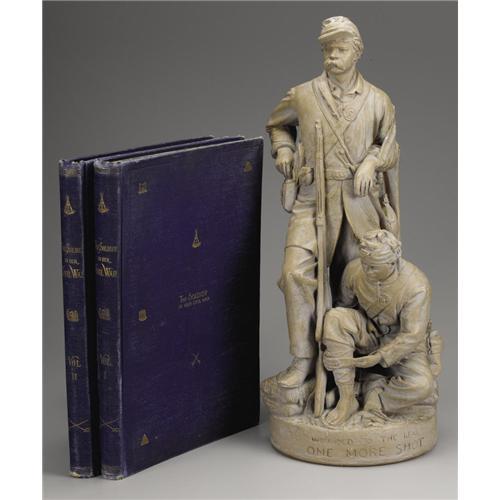 <B>“Wounded…to the Rear - One More Shot”, a Sculpture by noted Civil War Sculptor John Rogers.</B></I> Rogers (1829-1904) was born in Salem, Massachusetts and originally trained as an engineer. He studied sculpture in Rome and Paris for a short time in 1858 but returned to the United States where he opened a studio in New York in 1859. This sculpture is from some of his earliest work that focused on the Civil War. <BR><BR>“Wounded to the Rear - One More Shot” is a painted plaster sculpture approximately 21” in height and 11” wide at its base. An example identical to this piece is located in the Smithsonian Institution, numbered 1882.1.6 and was a gift of the sculptor Rogers and his son. Depicted in this dramatic work are two soldiers in the midst of battle - one wounded with the other standing figure reaching into his cartridge box for "one more shot" before helping his wounded comrade from the field. The detail of the sculpture is continued 360 degrees with the most minute of points in the uniform such as the "US" belt buckle and federal eagle on the shoulder strap defined. <BR><BR>With the title 'Wounded…to the Rear' carved into the front of the base, the artist's name appears on the side of the knapsack on which the standing soldier's right foot rests. On the reverse of the base are the words “Patented Jan 17, 1865”. This is truly a monumental work by a renowned Civil War artist. <BR><BR><B>Provenance:</B></I> <I>Civil War Veterans; The Tharpe Collection of American Military History</B></I> <BR><BR><B>Exhibited:</B></I> <I>The Liberty Heritage Society Museum</B></I><BR><BR><b>Shipping:</b> Other (oversized items, group lo (<a target="_blank" href="http://www.heritageauctions.com/common/shipping.php">view shipping information</a>)