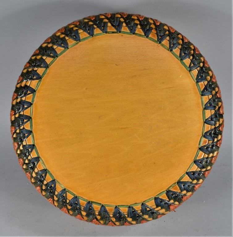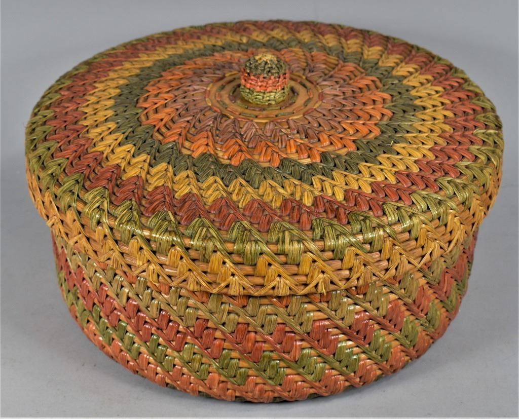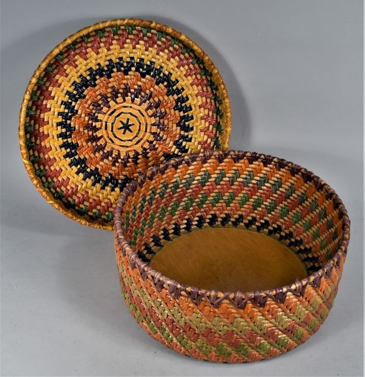 Woven Basket. Very colorful and well made woven basket, 7 colors. Know on lid is affixed to wood circle and attached weaving. Sturdy wood bottom is also attached to woven bottom and sides. Excellent condition. 11 inch diameter X 5 inches tall w/o knob on top.