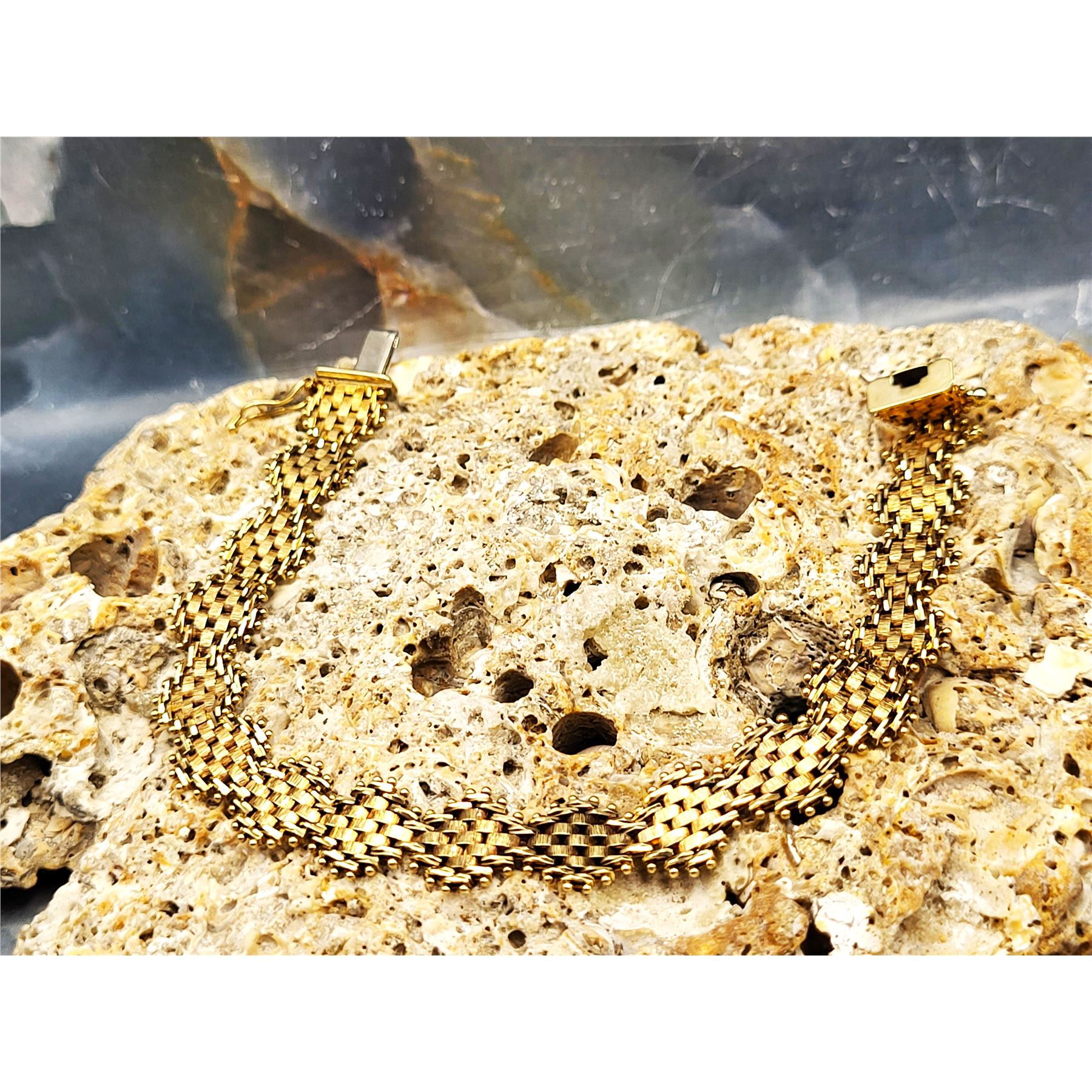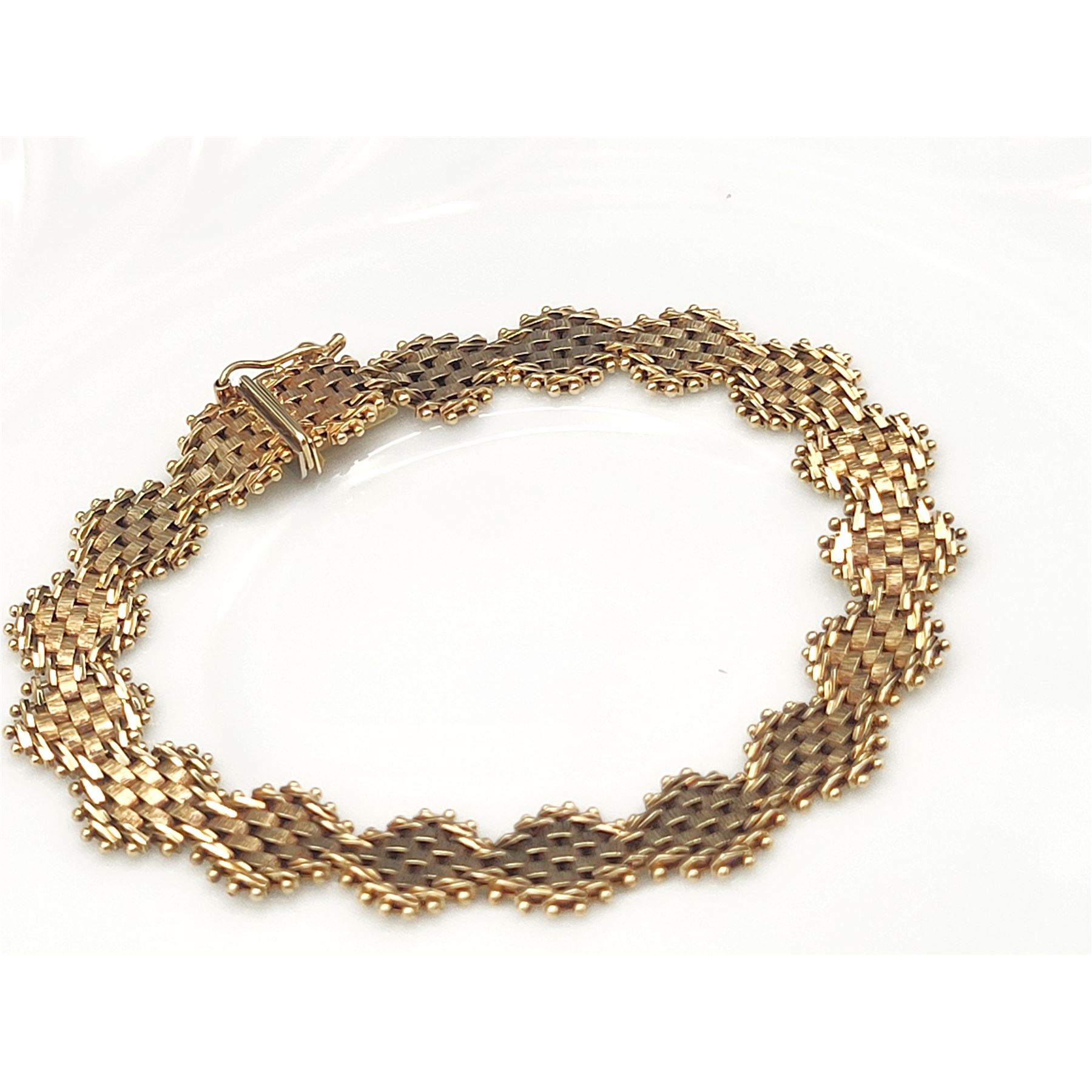 This bracelet is in very good condition and is circa 1987-88.& nbsp; It is 7& quot; long and has asymmetric links of woven mesh in yellow, white, and rose gold.& nbsp; The bracelet is secured with a hidden box clasp and a figure 8 safety clip. Admin: TC4.25epr.