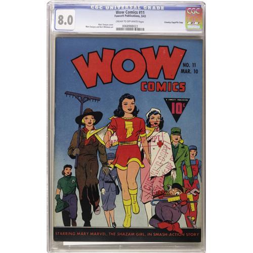 <B>Wow Comics #11 Crowley Copy/File Copy (Fawcett, 1943) CGC VF 8.0 Cream to off-white pages.</B></I> Marc Swayze cover and art. Two Checking Copy stamps on cover. Overstreet 2006 VF 8.0 value = $293. CGC census 10/06: 1 in 8.0, 1 higher.<BR><BR><b>Shipping:</b> Slabbed Comic (<a target="_blank" href="http://www.heritageauctions.com/common/shipping.php">view shipping information</a>)