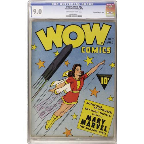 <B>Wow Comics #12 Crowley Copy/File Copy (Fawcett, 1943) CGC VF/NM 9.0 Cream to off-white pages.</B></I> The Mary Marvel cover marks her fifth appearance in the series. A Checking Copy stamp appears on the cover. Overstreet 2006 VF/NM 9.0 value = $459; NM- 9.2 value = $625. CGC census 10/06: 3 in 9.0, none higher.<BR><BR><b>Shipping:</b> Slabbed Comic (<a target="_blank" href="http://www.heritageauctions.com/common/shipping.php">view shipping information</a>)