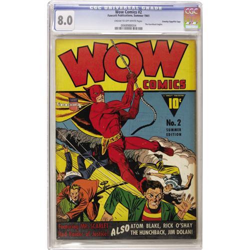 <B>Wow Comics #2 Crowley Copy/File Copy (Fawcett, 1941) CGC VF 8.0 Cream to off-white pages.</B></I> Mr. Scarlet is the star of this Fawcett book and most of the series. The Hunchback, a playboy who dons a hunchback costume to fight villainy, premieres in this second issue. Overstreet considers the issue to be "scarce." A faint Checking Copy stamp appears on the cover of this file copy. Overstreet 2006 VF 8.0 value = $1,669. CGC census 10/06: 1 in 8.0, 2 higher.<BR><BR><b>Shipping:</b> Slabbed Comic (<a target="_blank" href="http://www.heritageauctions.com/common/shipping.php">view shipping information</a>)