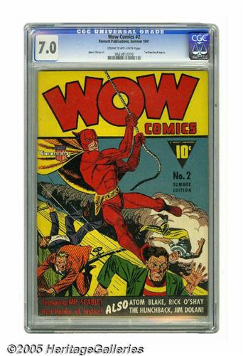 <B>Wow Comics #2 (Fawcett, 1940) CGC FN/VF 7.0 Cream to off-white pages.</B></I> Simon and Kirby's Mr. Scarlet takes out some unlucky hoodlums on the cover of this issue, and the Hunchback debuts inside. Early issues of <B>Wow</B></I> rank among the hardest-to-find Fawcett titles printed (Overstreet lists this one as "scarce," and <B>The Photo-Journal Guide to Comic Books</B></I> lists it as "uncommon.") Overstreet 2005 FN 6.0 value = $738; VF 8.0 value = $1,538. CGC census 6/05: 1 in 7.0, 3 higher.