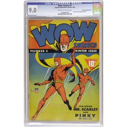 <B>Wow Comics #4 Crowley Copy/File Copy (Fawcett, 1942) CGC VF/NM 9.0 Cream to off-white pages.</B></I> Pinky, the trusty sidekick of Mr. Scarlet, makes his first appearance in this pedigree book. The cover has him leaping into action beside his mentor. Overstreet 2006 VF/NM 9.0 value = $1,244; NM- 9.2 value = $1,700. CGC census 10/06: 2 in 9.0, 1 higher.<BR><BR><b>Shipping:</b> Slabbed Comic (<a target="_blank" href="http://www.heritageauctions.com/common/shipping.php">view shipping information</a>)