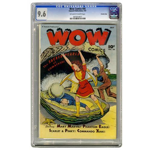 <B>Wow Comics #56 Crowley Copy (Fawcett, 1947) CGC NM+ 9.6 Off-white to white pages.</B></I> This is the only 9.6, and highest-graded copy overall, that CGC has certified for this issue to date. The issue's all-teen cover features Mary Marvel and the Phantom Eagle. Overstreet 2005 NM- 9.2 value = $200. CGC census 12/05: 1 in 9.6, none higher.