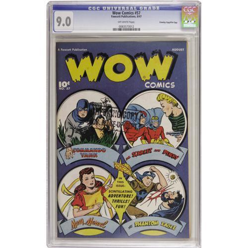 <B>Wow Comics #57 Crowley Copy/File Copy (Fawcett, 1947) CGC VF/NM 9.0 Off-white pages.</B></I> Featuring Mary Marvel. Overstreet 2006 VF/NM 9.0 value = $159; NM- 9.2 value = $210. CGC census 10/06: 1 in 9.0, 1 higher.<BR><BR><b>Shipping:</b> Slabbed Comic (<a target="_blank" href="http://www.heritageauctions.com/common/shipping.php">view shipping information</a>)