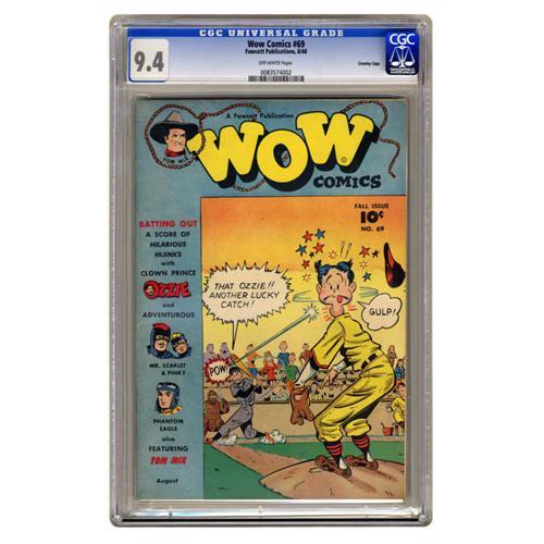 <B>Wow Comics #69 Crowley Copy pedigree (Fawcett, 1948) CGC NM 9.4 Off-white pages.</B></I> This final issue of the title is tougher to find than most -- our offering is the only copy of this Gerber "uncommon" that CGC has certified as of this writing. There's only one character who appeared in all 69 issues of the title, and go to the head of the class if you guessed Mr. Scarlet! Top billing went to Archie-esque teen character Ozzie, and the ubiquitous Tom Mix also appears. Overstreet 2005 NM- 9.2 value = $175. CGC census 12/05: 1 in 9.4, none higher.