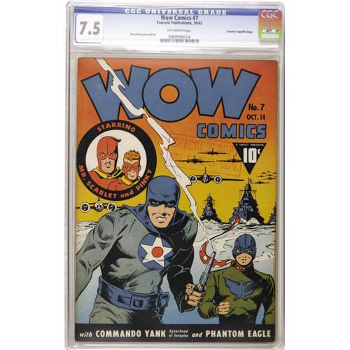 <B>Wow Comics #7 Crowley Copy/File Copy (Fawcett, 1942) CGC VF- 7.5 Off-white pages.</B></I> Dave Berg story and art. Checking Copy stamp on cover. Overstreet 2006 VF 8.0 value = $388. CGC census 10/06: 1 in 7.5, 4 higher.<BR><BR><b>Shipping:</b> Slabbed Comic (<a target="_blank" href="http://www.heritageauctions.com/common/shipping.php">view shipping information</a>)