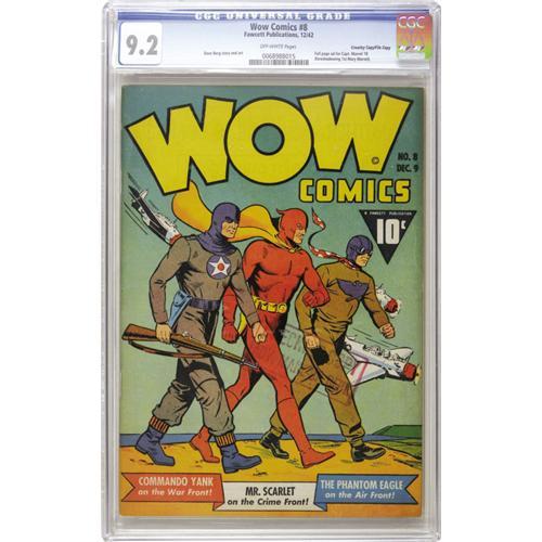<B>Wow Comics #8 Crowley Copy/File Copy (Fawcett, 1942) CGC NM- 9.2 Off-white pages.</B></I> Contains a full page ad for <B>Captain Marvel</B></I> #18, foreshadowing the first appearance of Mary Marvel. Dave Berg story and art. Checking Copy stamp on cover. Overstreet 2006 NM- 9.2 value = $840. CGC census 10/06: 2 in 9.2, none higher.<BR><BR><b>Shipping:</b> Slabbed Comic (<a target="_blank" href="http://www.heritageauctions.com/common/shipping.php">view shipping information</a>)