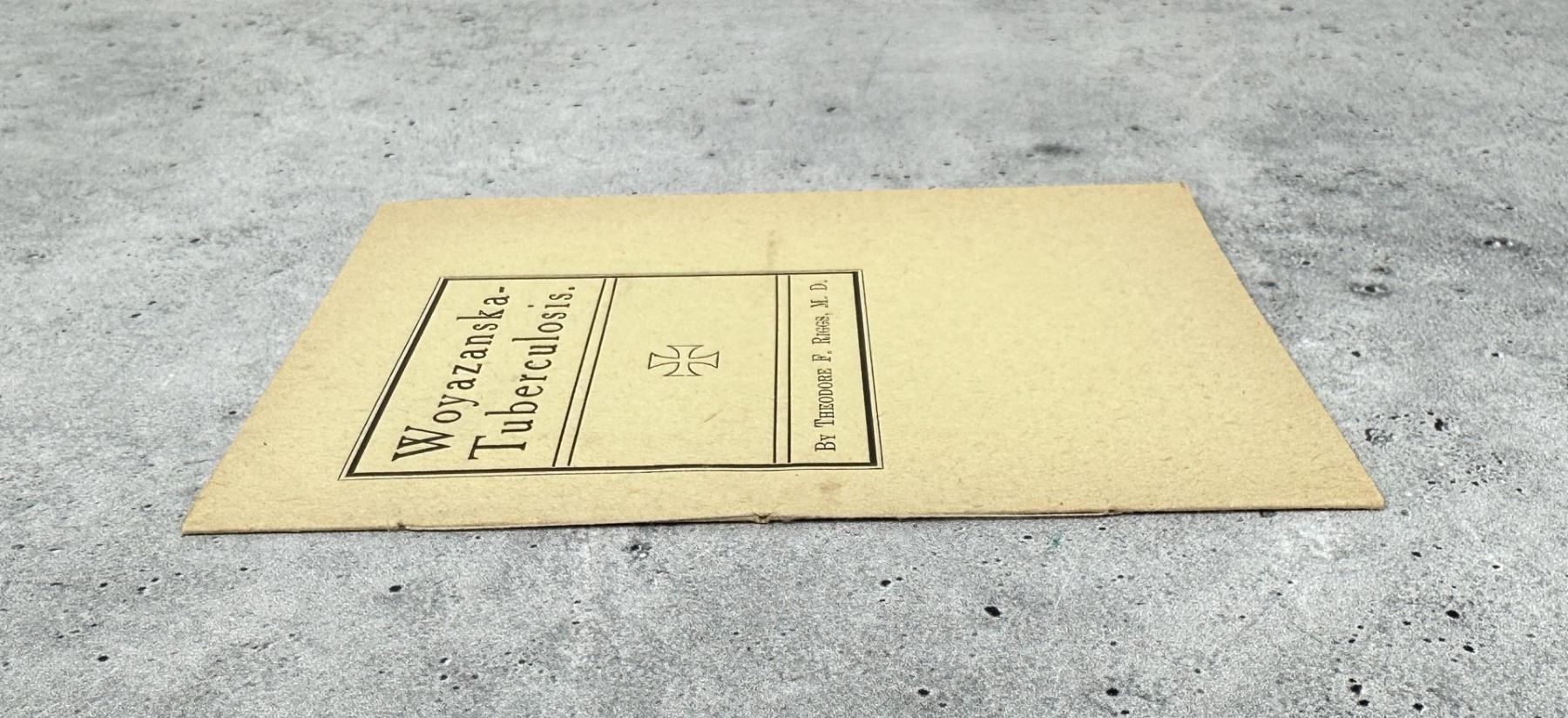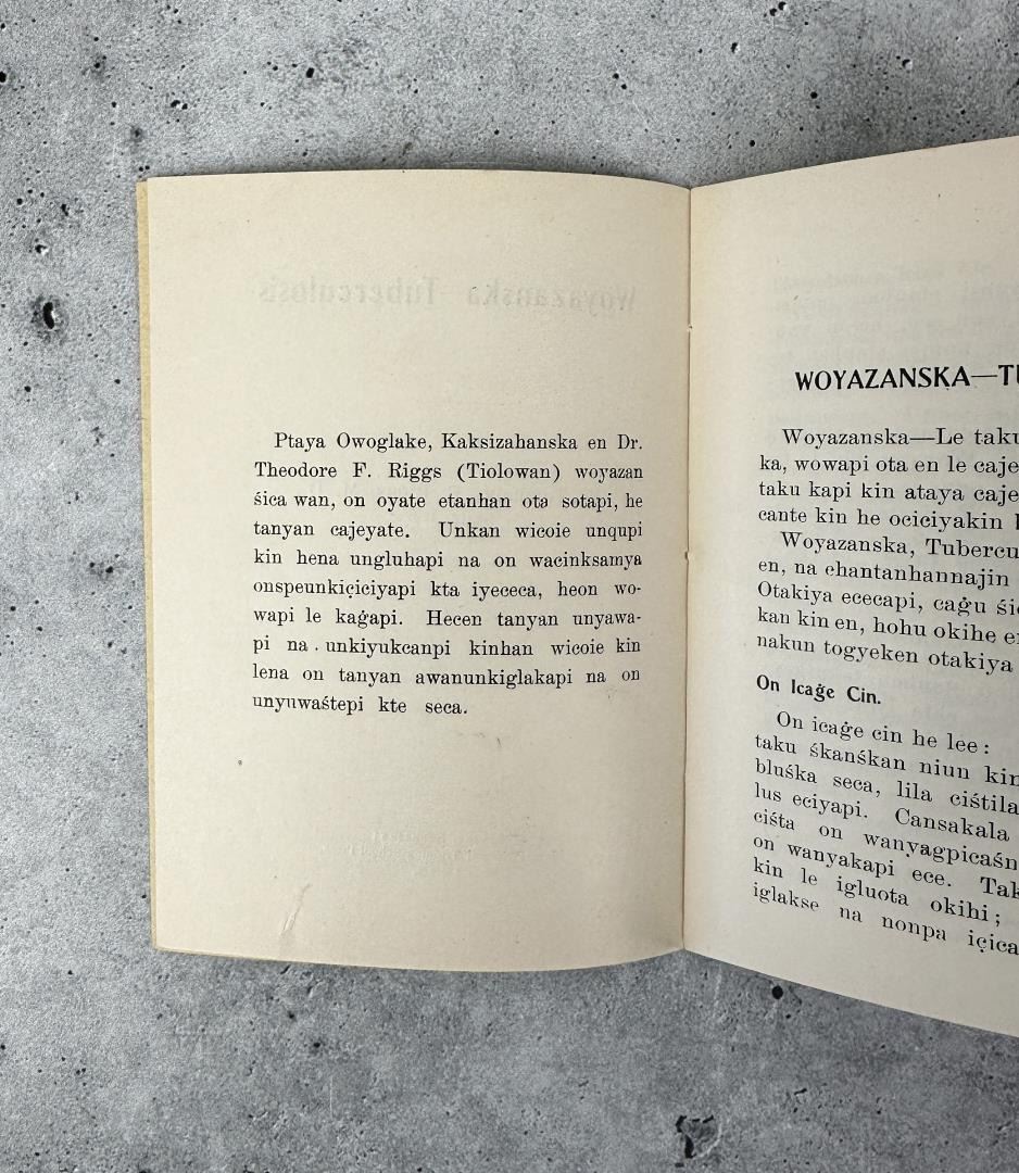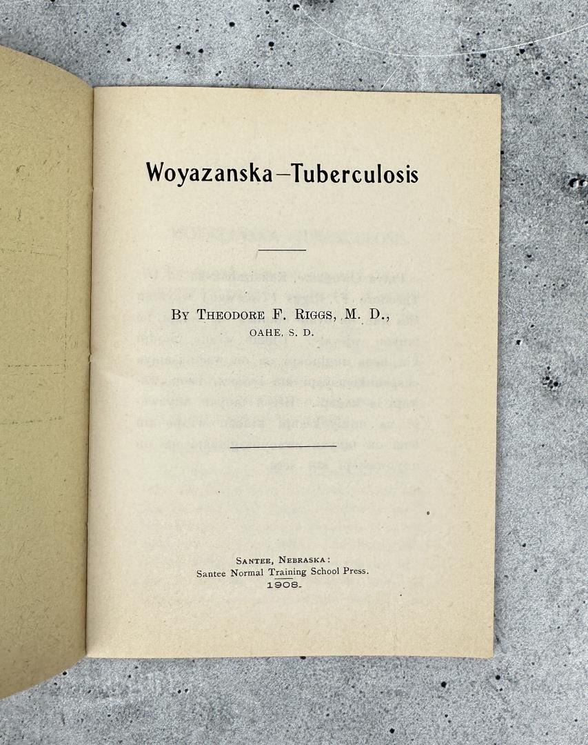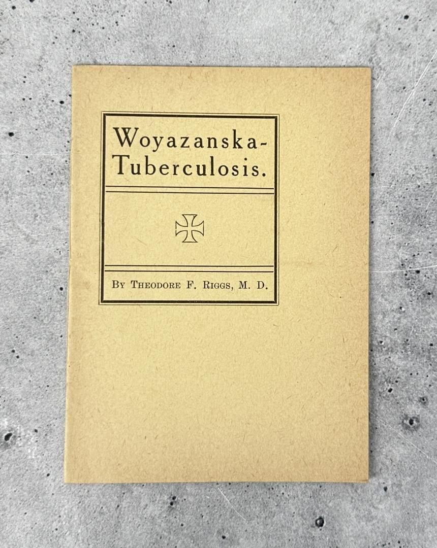 Theodore F Riggs MD, 1908. This pamphlet was used to educate Dakota people about Tuberculosis. The Santee Normal Training School instructed Dakota children in the Dakota language. These children came from families who were removed from Minnesota to Nebraska after the U.S.-Dakota War in 1863. Reverend A.L. Riggs founded the school in 1870 as an academy to train Native teachers. The school developed a printing press in 1871 and produced many materials in the Dakota language. This publication is quite rare and most known copies are in institutions.