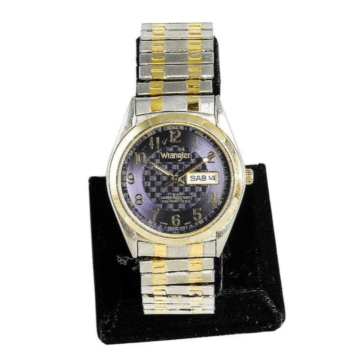 Vintage Wrangler Hero unisex quartz analog wristwatch. Navy / Purple dial face with gold numbers Hands & Wrangler symbol. Water resistant to 30 meters. Stainless steel stretch band. Day & date display. Needsreplacement battery.