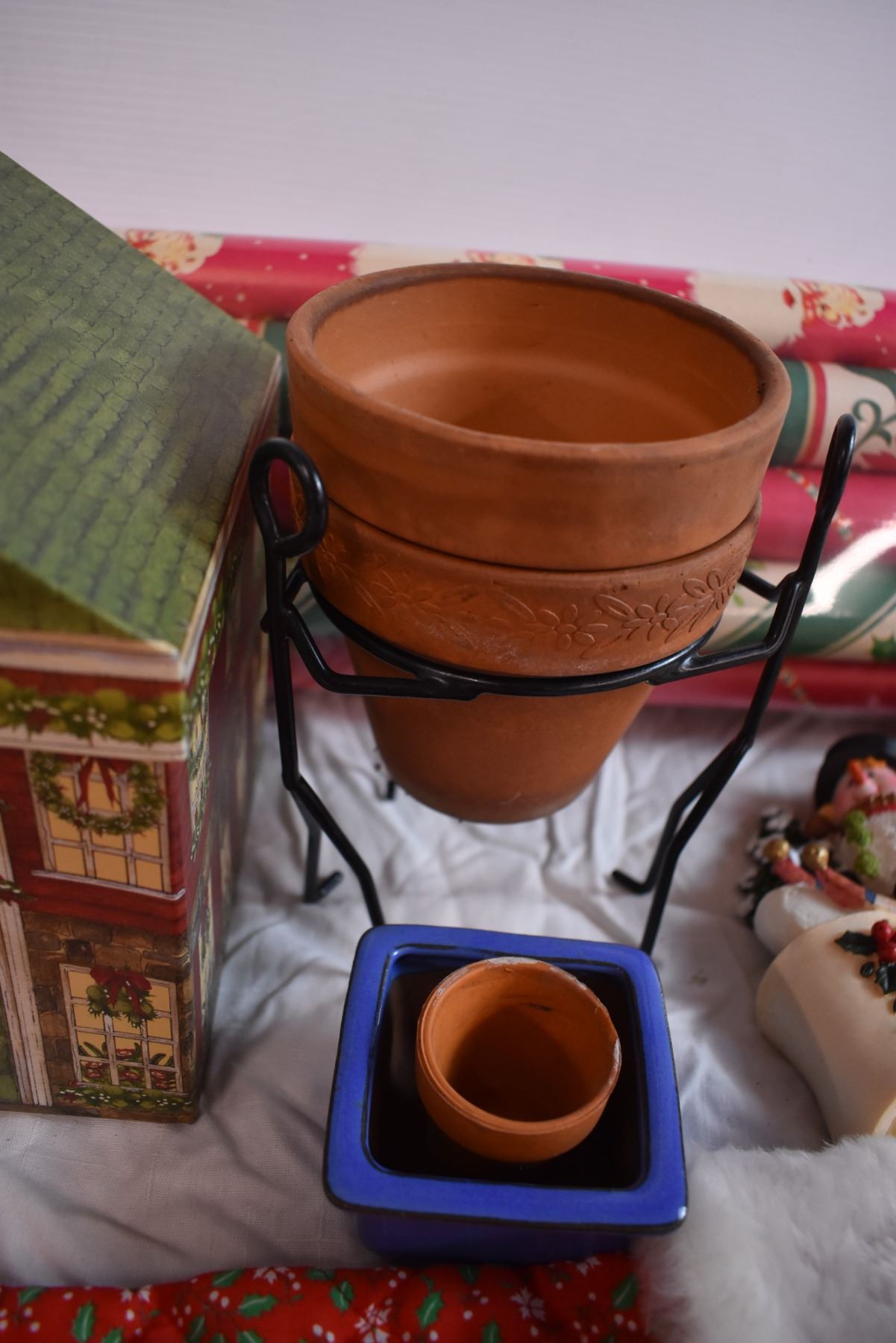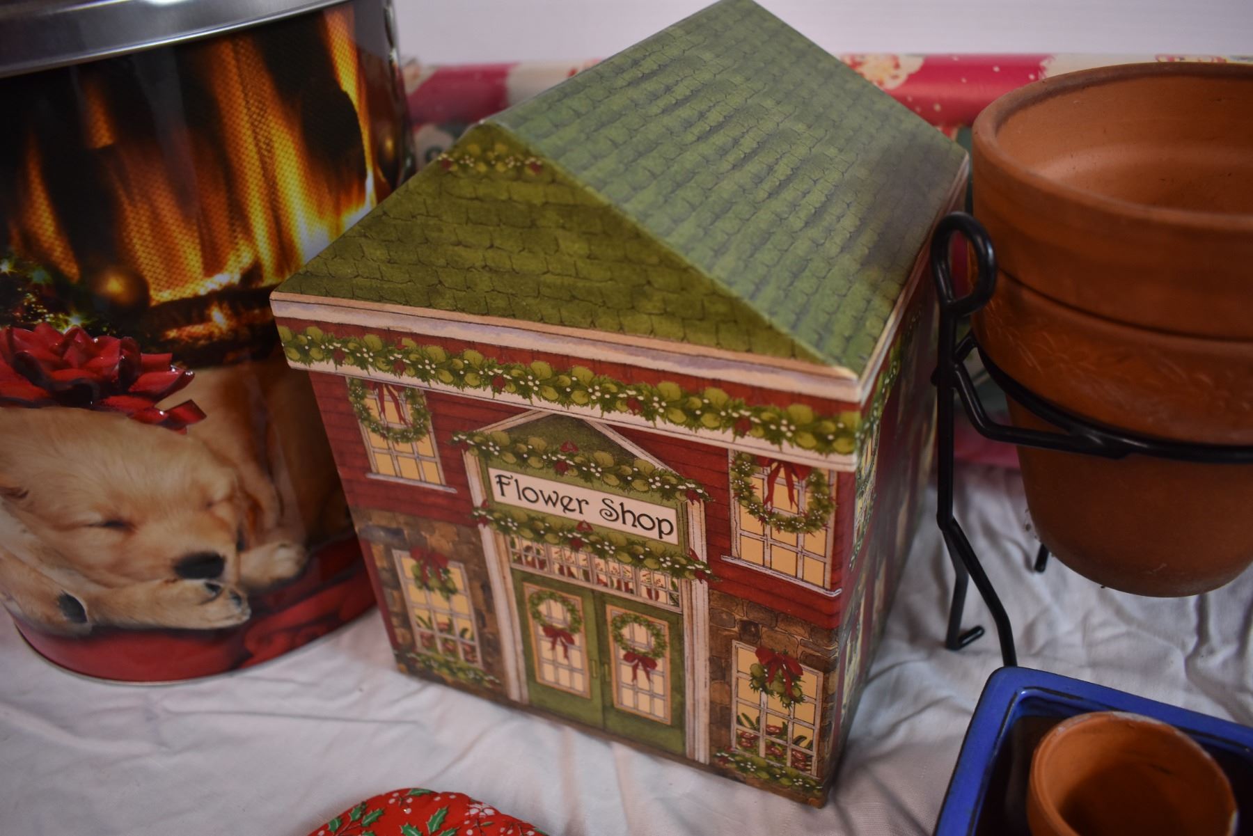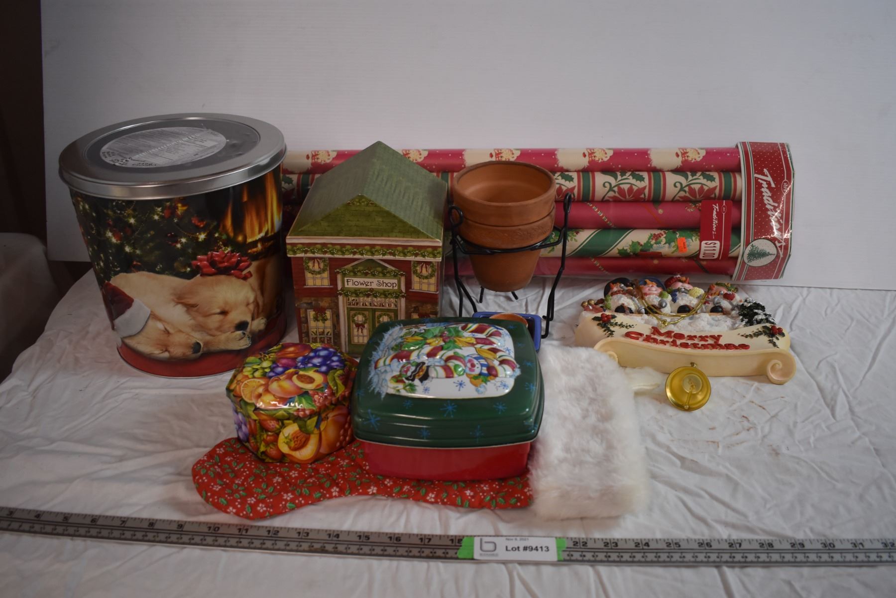 Wrapping Paper, Flower Planters, Christmas Ornament, and Tins