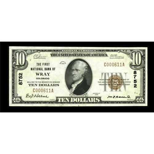 <B>Wray, CO</B></I> - $10 1929 Ty. 1 <B>The First NB</B></I> Ch. # 8752<BR> An attractive and well centered piece displaying plenty of original embossing. <B>About Uncirculated.</B></I><BR><BR><b>Shipping:</b> Coins & Currency (<a target="_blank" href="http://www.heritageauctions.com/common/shipping.php">view shipping information</a>)