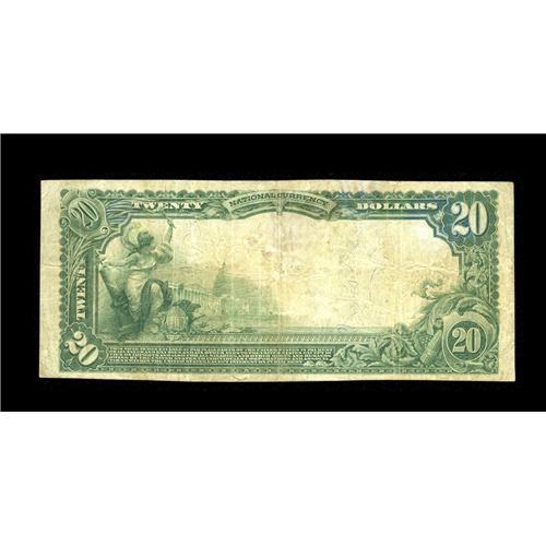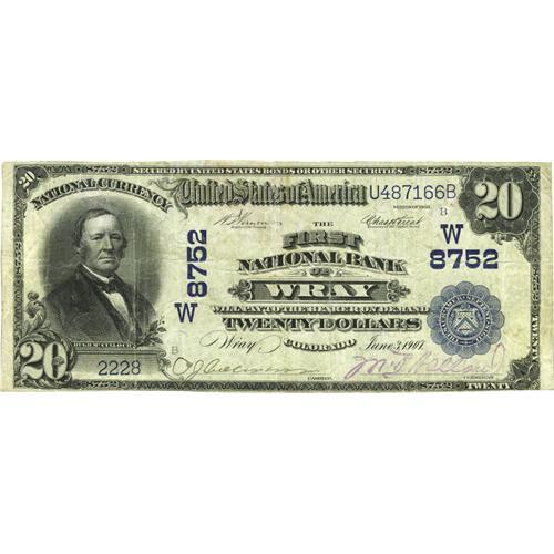<B>Wray, CO</B></I> - $20 1902 Plain Back Fr. 652 <B>The First NB</B></I> Ch. # (W)8752<BR>This is one of just four large size notes known from this better Yuma County bank. It's a nice circulated piece with no flaws or problems to speak of, and offers considerably eye appeal along with clear two color signatures. <B>Fine-Very Fine.</B></I>