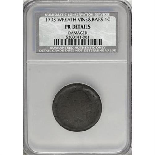 <B>1793 Wreath 1C --Wine&Bars--Damaged--NCS. PR Details.</B></I> NGC Census: (0/0). PCGS Population (0/0). Mintage: 63,353. (#1344)<BR><BR><B>Coin Engraver:</B> Henry Voigt<BR><BR><b>Shipping:</b> Coins & Currency (<a target="_blank" href="http://www.heritageauctions.com/common/shipping.php">view shipping information</a>)