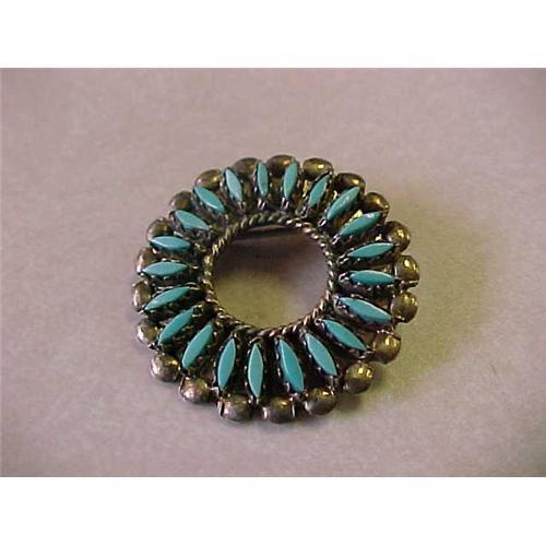 Wreath Shaped Turquoise And Sterling Brooch/Pendant. Signed 2UNI on reverse side. Each piece of turquoise is a lovely oval shaped piece almost 1/8? long. There is a standard safety clasp and a pendant chain holder on reverse. The diameter is a little over 1 inch. Sweet piece!