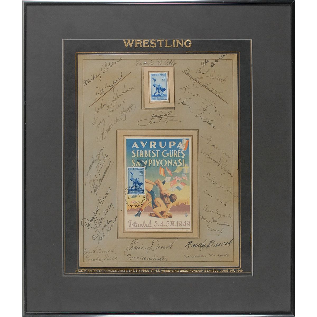 Vintage fountain pen signatures of 24 professional wrestlers on a light gray 9 x 12 mount with a 1949 Turkish commemorative postage stamp affixed near the top and a small reproduction poster for the 1949 Freestyle Wrestling Championship affixed near the bottom. Signers are: Don Leo Jonathan, ‘Mr. America’ Gene Stanlee, Man Mountain Dean, Jr., Mickey Cartolano, Fritz Siegfried, John Hudman, Tony Milano, Mario DeSouza, ‘Bibber’ McCoy, Hal Kamner, Emil Dusek, Ernie Dusek, Tony Martinelli, Warren Wood, Rudy Dusek, Dan Prata, Ilio diPaolo, Edwin Baillargeon, Nit Fox, Abe Coleman, Bud Gilbert, and Frank D’Allo. Matted and framed to an overall size of 15.5 x 18. In fine condition.