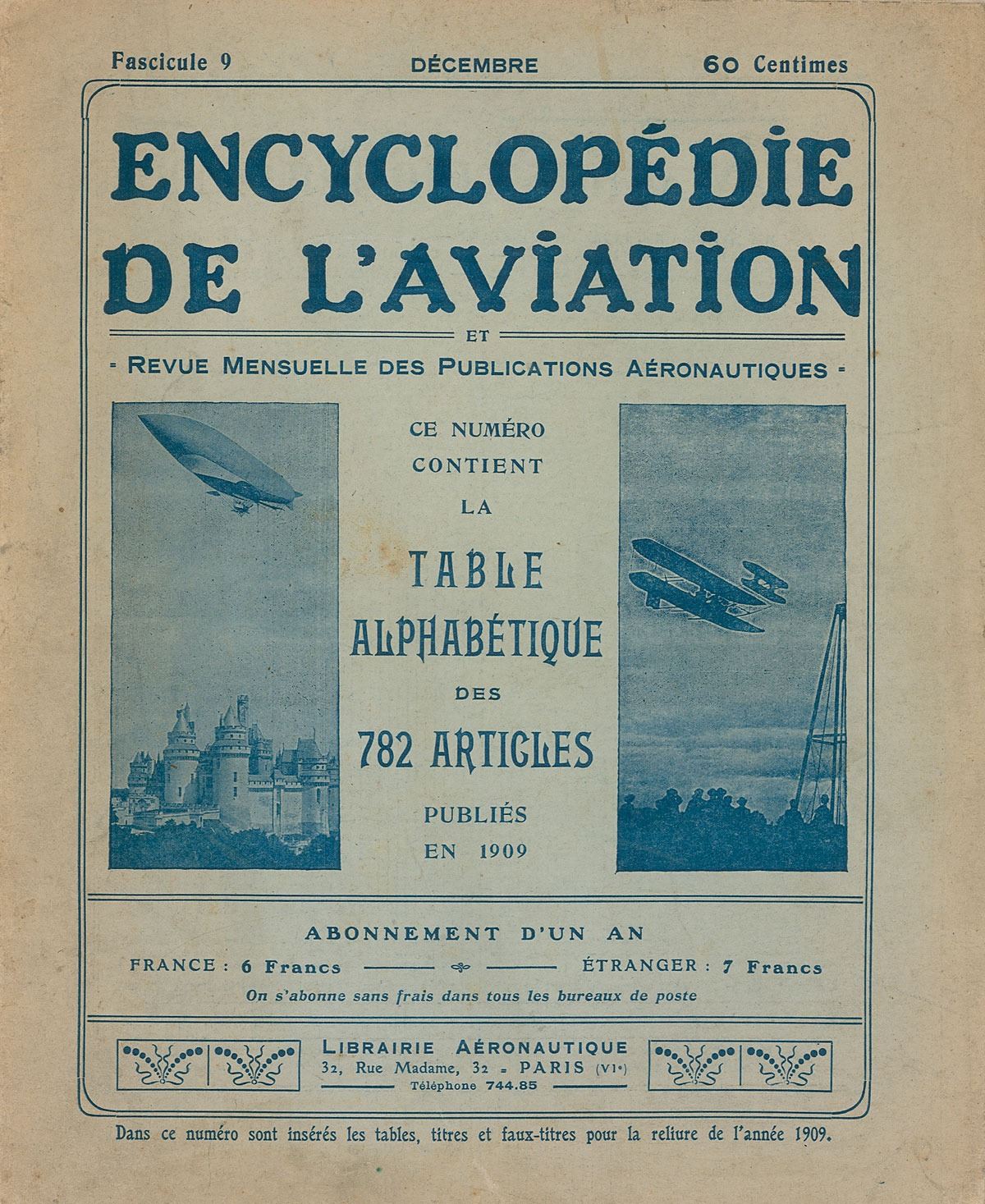Original December 1909 issue of Encyclopedie de l'Aviation, 8.5 x 10.5, published in Paris and containing an alphabetical listing of 782 previously published articles. Scattered toning and soiling to covers, as well as scattered creases and handling wear, otherwise fine condition.