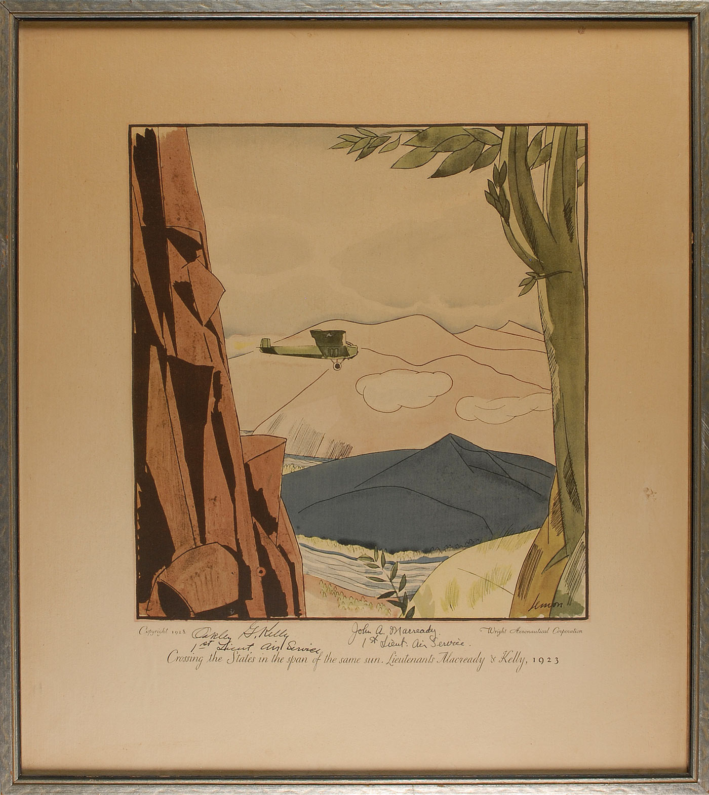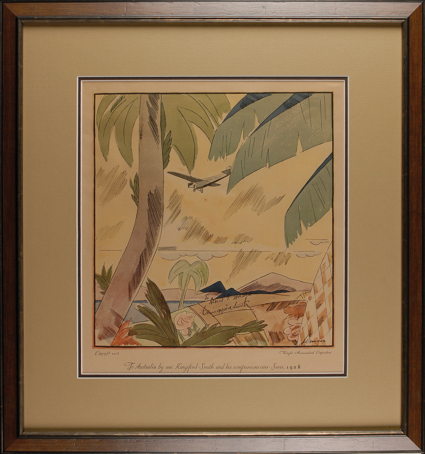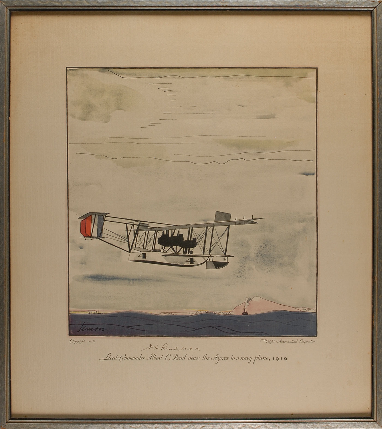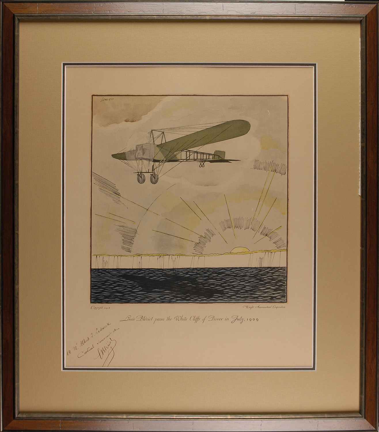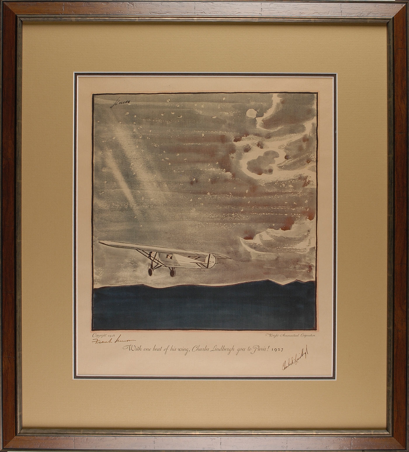 Rare, un-numbered and signed collection of the Wright Aeronautical Corporation's 1928 Flights hand-colored lithograph set, depicting historic feats accomplished by pioneers of the air. The spectacular color lithos measure approximately 14.5 x 18, four of which are proof copies, featuring works by noted artist Frank Lemon, and each of the illustrations are signed in fountain pen by its famous aviator subject. Signers are: Orville Wright; Charles A. Lindbergh, Louis Bleriot, inscribed to Albert I. Lodwick; Richard E. Byrd, inscribed to H. S. Hartman (also signed by Harold Irving, Ashley McKinley and one other); Charles Kingsford-Smith, inscribed to Wright Aeronautical Corporation executive Albert I. Lodwick; A. C. Read; and John A. Macready and Oakley Kelly. Two of the prints are also signed by the artist, Frank Lemon. Each of the prints is individually framed, some are also double matted, to approximate sizes of 20.5 x 22 or slightly smaller, with four having been archivally framed. In fine condition, with expected mild toning. Accompanied by carbons of a lengthy two year collection of correspondence from Hartman to various people and organizations, attempting to assemble an autographed set of lithographs.