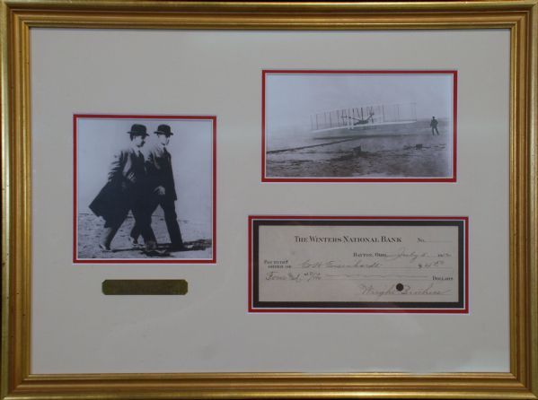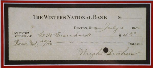 Wright brother who assisted brothers Orville and Wilbur with many experiments, but primarily was involved with the business affairs of the Wright Cycle Company. Signed bank check, 8.25 x 3, July 5, 1912, Winters National Bank, payable to C.H. Eisenhardt for $4.50. Penned entirely in Lorin's hand and uniquely signed "Wright Brothers" on the signature line in black ink. In fine condition. Cancelation hole just touching W.Esquisetly framed in gold with photos of the wright brothers and thier famous moment in history.
