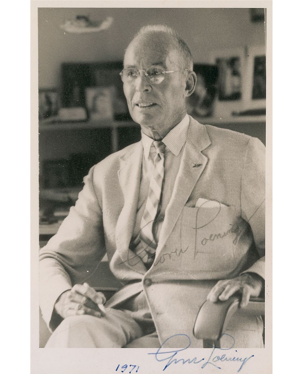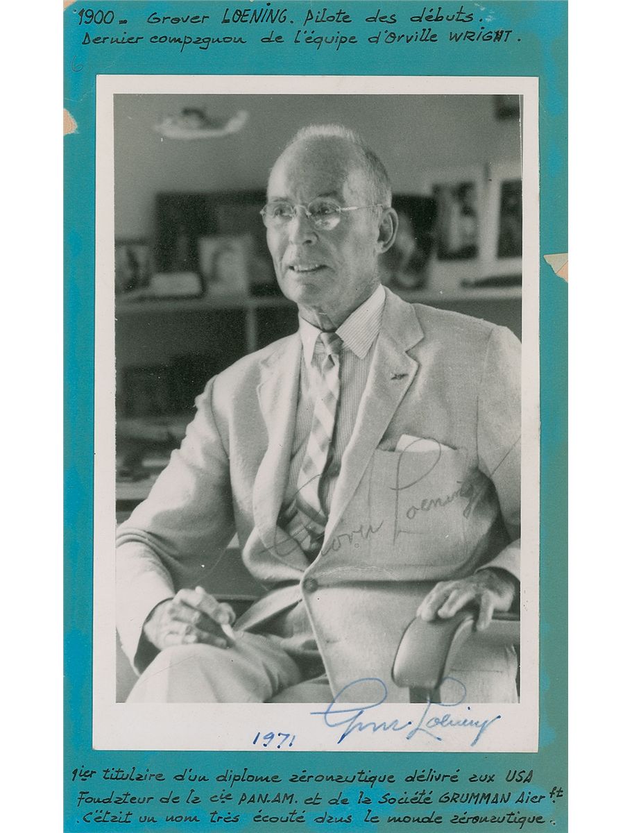 Aircraft manufacturer (1888–1976), who managed the Dayton, Ohio Wright Company factory in 1913 and 1914. Matte-finish 4.5 x 7 photo of Loening, affixed to a 5.25 x 8.5 mount with collector’s notations, signed in the lower border in blue ink, “Grover Loening 1971.” In fine condition, with a pre-printed signature in the image.
