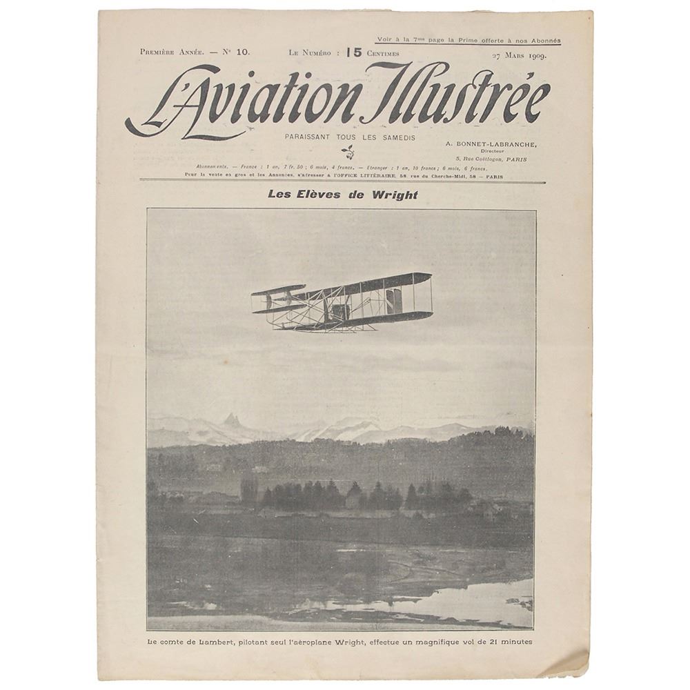 Original French publication entitled "L'Aviation Illustree," 11 x 15, eight pages, dated March 27, 1909. Front page features a large image of a Wright Flyer in the air over the French countryside. A central horizontal fold, scattered light toning and soiling, and creases to lower right corners, otherwise fine condition.