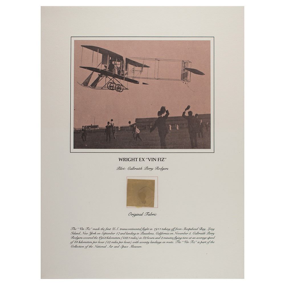 Flown fabric presentation created by the Smithsonian Institution National Air and Space Museum featuring an affixed beige 2 x 2 swatch of wing fabric removed from Calbraith Perry Rodgers's Wright Brothers Vin Fiz, which made the first US transcontinental flight in 1911. The swatch is affixed to its original 15 x 20 informational poster. In fine condition. Accompanied by the original information packet issued by the National Air and Space Museum.