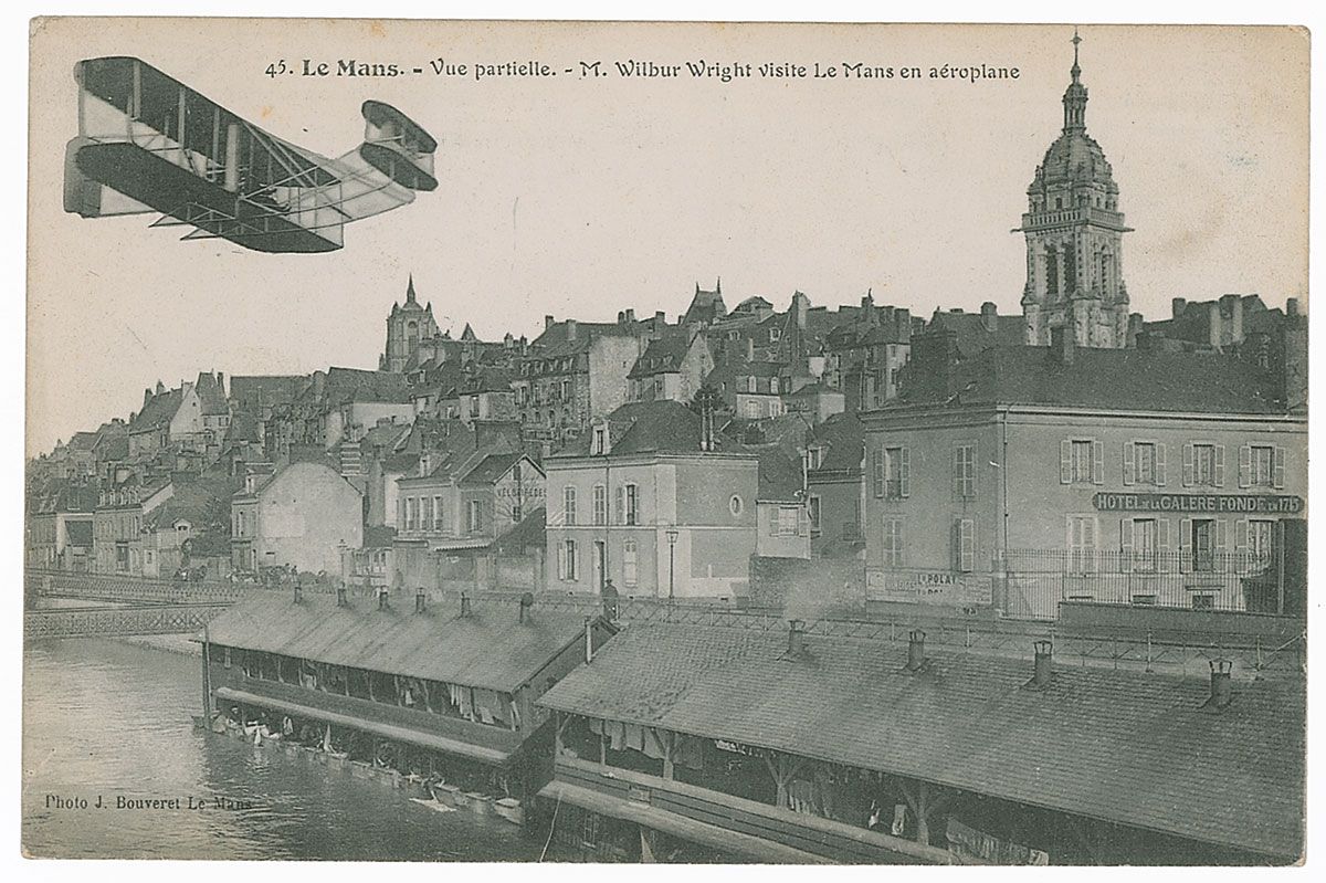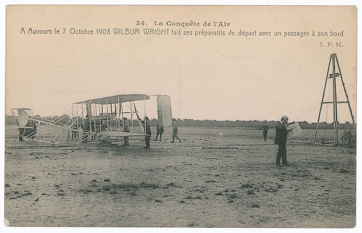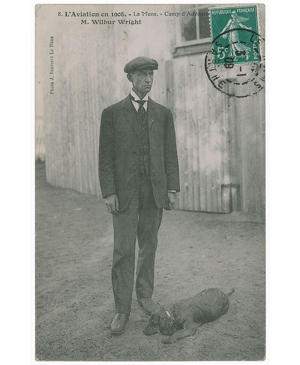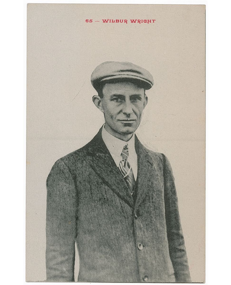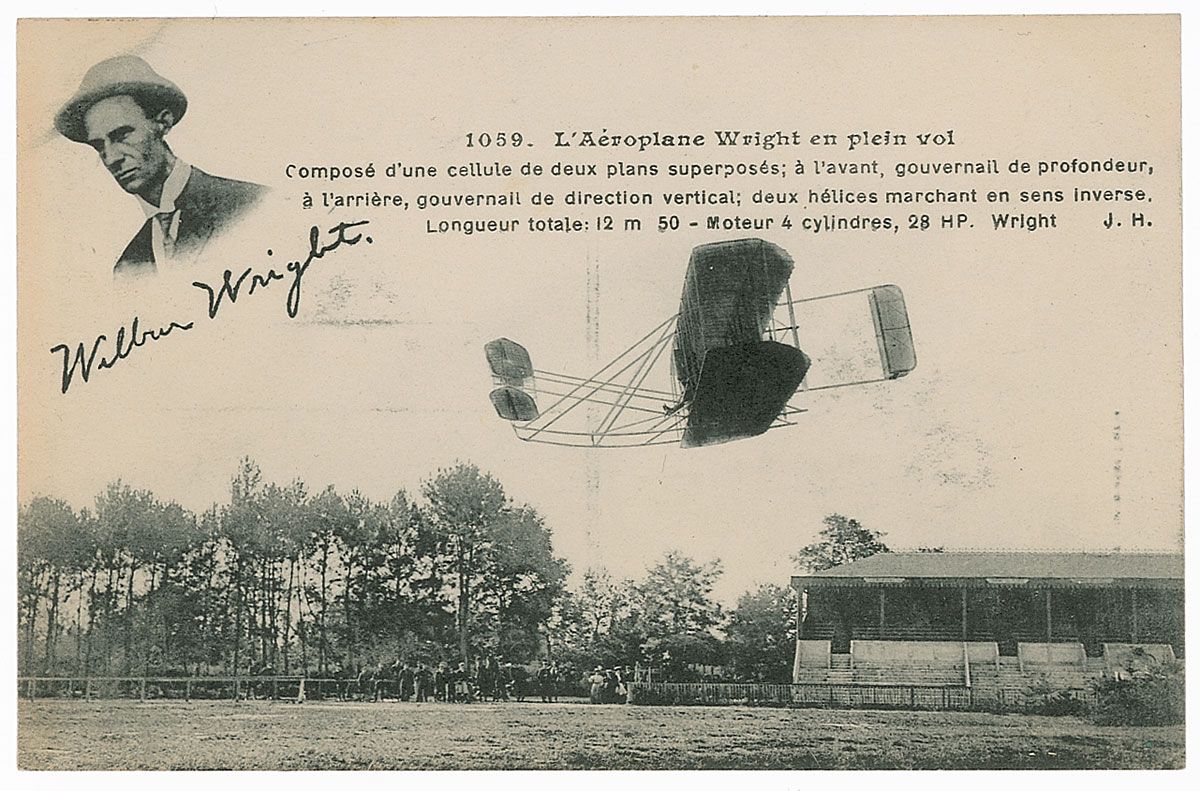 Collection of 58 vintage aviation postcards from France, primarily circa 1910, 24 related to the Wright Brothers, most postally unused. Among the selection are six postcards depicting Wilbur Wright (three traditional portraits and three caricatures), a series of 11 showing the Wright Flyer in various states of flight with smaller images of Wilbur or Orville in the corner, five similar to these but lacking the smaller portrait, and a couple illustrated postcards of the Wrights in France. The non-Wright postcards include 14 related to Leon Delagrange, with the remaining showing Samuel Franklin Cody, Emile Dubonnet, Elie Hanouille, Emile Allard, Stefano Amerigo, Rene Grandjean, Alessandro Anzani, and Louis Godard. In overall fine condition.